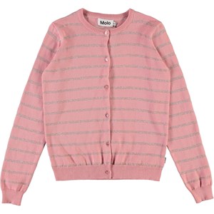 Georgina is a pink cotton cardigan with silver glitter stripes. It is in a delicate knit pattern and has a button closure.
