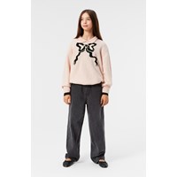Soft wool-blend jumper in powder pink with a regular fit and round neckline. Ribbed cuffs and hem provide a nice finish. The jumper features an elegant knitted collar and a large black bow on the front, adding a sophisticated touch.