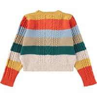 Multicolored wool sweater. The sweater has a slightly cropped fit, a beautiful cable pattern and stripes in lovely bold colors. Ribbed edges around the round neckline, the sleeves and waits.