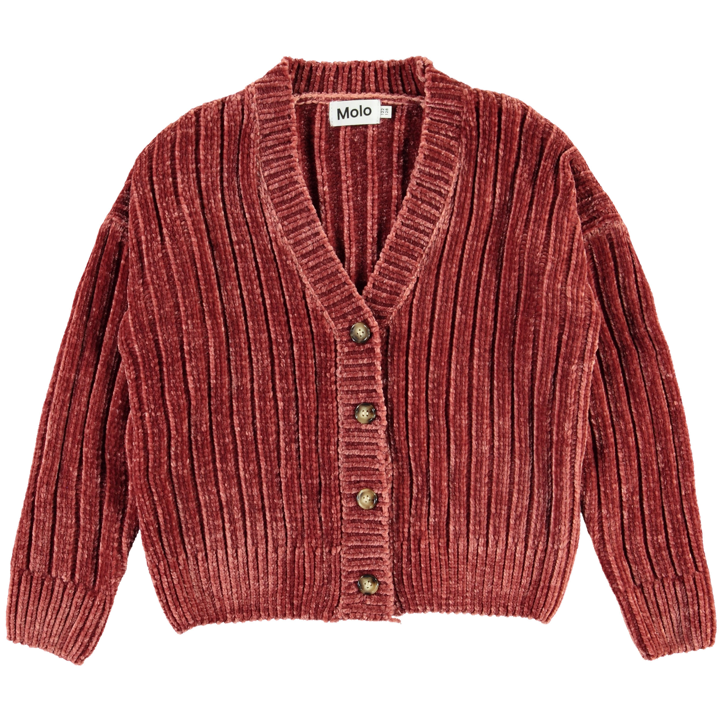 Gianna is Molo's new chenille knit cardigan in a golden colour. The cardigan is short, has a v-neck and a button closure.