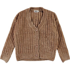 Gianna is Molo's new chenille knit cardigan in brown. It has a v-neck, a short fit and a button closure.