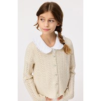 Off-white knitted cardigan in soft organic cotton with a lovely lace pattern and wavy edges on the sleeves and bottom of the cardigan. The cardigan has a regular fit, mother-of-pearl buttons on the front, and ribbed edges at the neckline.