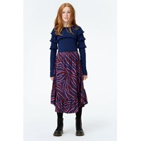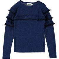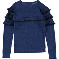 Gilah is a dark blue glitter top with long sleeves with ruffles.