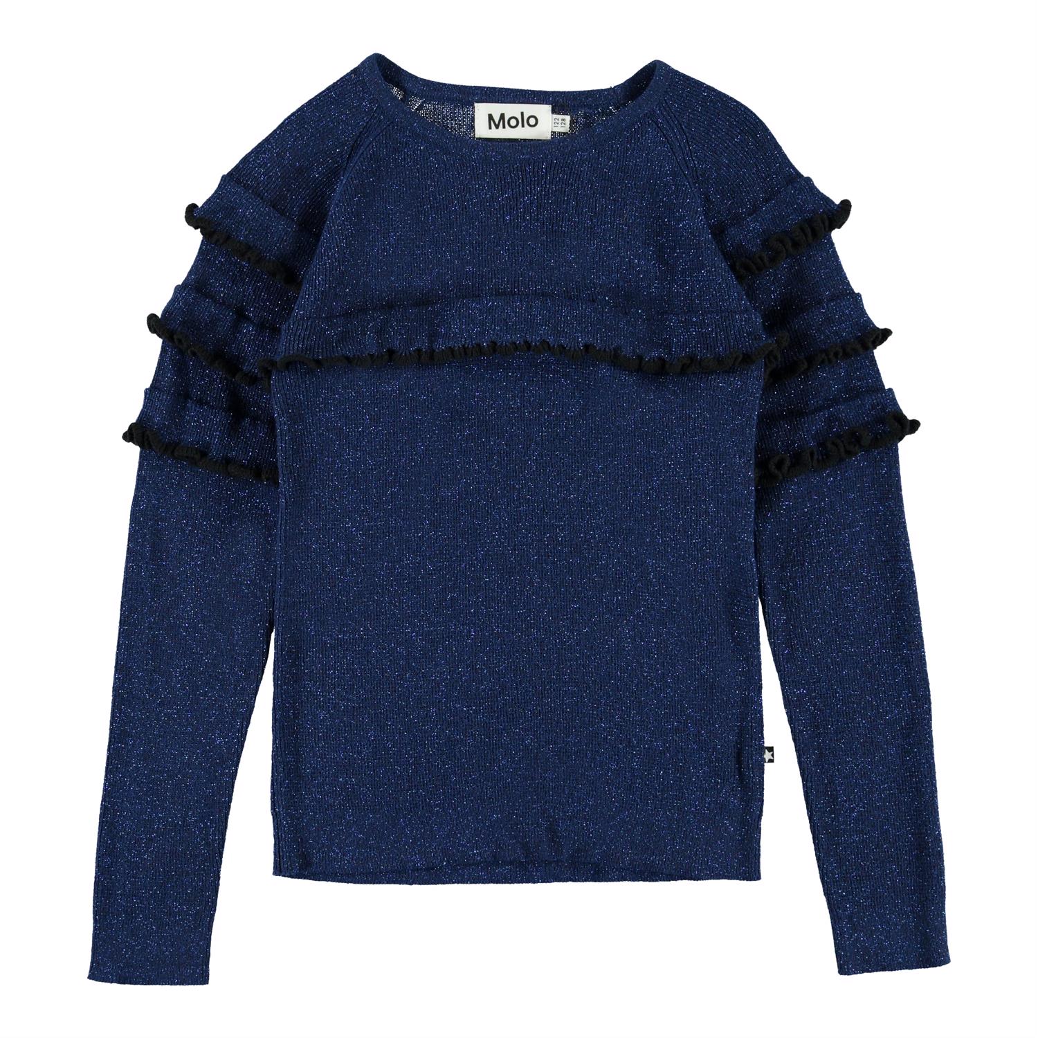 Gilah is a dark blue glitter top with long sleeves with ruffles.