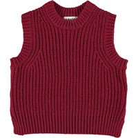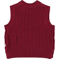 Gilberte is a dark red knit waistcoat. It has a round neck and slits at the sides.