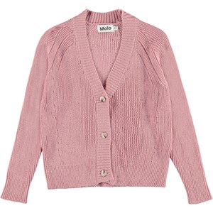 Gilda is a rose coloured knit cardigan. It is short with a v-neck and button closure.