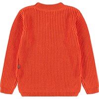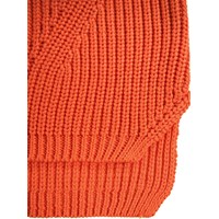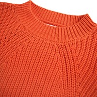 Orange long-sleeved knitted sweater made of soft organic cotton with a round neck. The sweater has a loose fit, is ribbed with a fine patern, has extra length at the back, and slits on the sides.