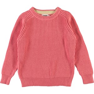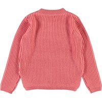 Gillis is a pink cotton knit top with long sleeves. The top has a round neck and a delicate knit pattern. It is longer in the back and shorter at the sides.