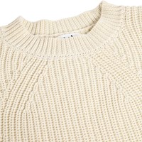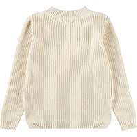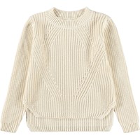 Off-white long-sleeved knitted jumper made of soft organic cotton with a round neck. The jumper has a loose fit, is rib-knitted with fine increases and decreases, has extra length at the back and slits at the sides.