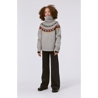 Light grey melange knit jumper with a roll-neck and a pattern. The pattern covers the front and back and is inspired by traditional nordic knitting. There is a graphic pattern on the sweater that consists of hearts, peace signs and smiley faces in various colours. This knit jumper is in a soft wool/acrylic blend. It has a high neck in a rib knit, long raglan sleeves with rib, rib at the bottom and is in a loose fit. It's perfect for colder days.