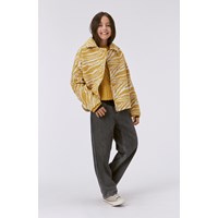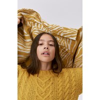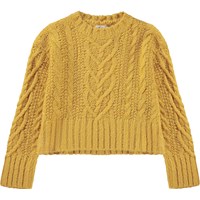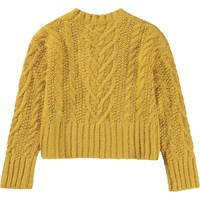 Yellow knit jumper in a cable knit. This knit jumper is in a soft alpace/wool blend. It is slightly cropped and has a round neck with a rib edge and a cable knit pattern on the body and the sleeves. The jumper has a wid rib at the sleeves and bottom and is in a loose fit.
