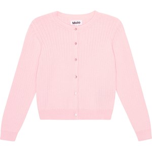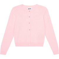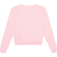 Pink cardigan in a soft, organic cotton. It's knit in a delicate, wide rib with a more narrow rib at the neck, sleeves and bottom. It has long sleeves and buttons down the front. The cardigan has a great shape.