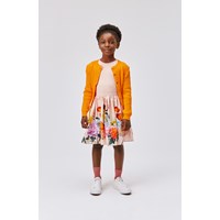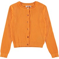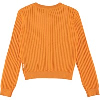 Gloria is a delicate knit cardigan in orange, with long sleeves, in 100% cotton. Gloria is a wide rib knit and has a 1x1 rib edge at the neck, sleeves and bottom. This style is perfect worn closed or open over a dress.