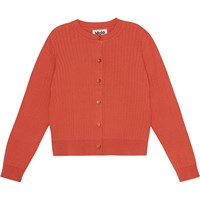 Red cardigan in a soft, organic cotton. It's knit in a delicate, wide rib with a more narrow rib at the neck, sleeves and bottom. It has long sleeves and buttons down the front. The cardigan has a great shape.