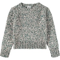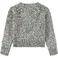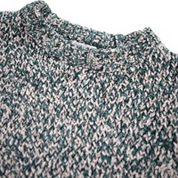 Knitted sweater made of a chenille yarn. The sweater is knitted in a beautiful green and pink melange, with ribbed edges around the neck, sleeves and waist.