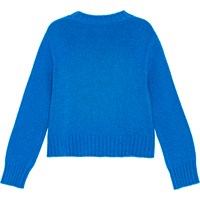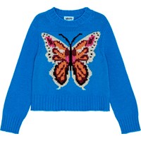 Blue knitted jumper in soft wool blend with a round neckline and ribbed edges on the sleeves, neckline, and waist. The jumper is wonderfully warm and has a regular fit with room for a long-sleeved T-shirt underneath. On the front, there is a large knitted butterfly in beautiful shades of orange and pink.