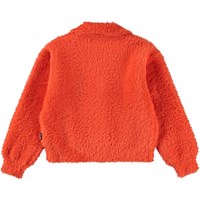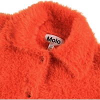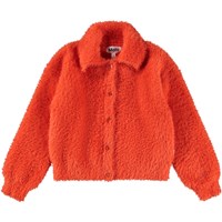 Orange cardigan with a red tint and fake fur look. This lovely cardigan has a small collar and buttons all the way down the front.