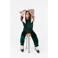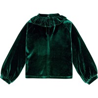 Soft green velvet blouse with ruffle collar. The blouse has a loose fit, a small collar, gathered sleeves and cuffs that add volume to the sleeve. Fastens with a small snap button at the back for easy dressing. Perfect for pairing with matching trousers for a stylish and comfortable jersey set.