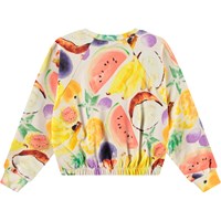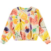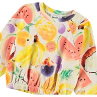 Off-white sweatshirt in soft organic cotton with ribbed edges at the neckline. The sweatshirt is short and has a loose fit with raglan sleeves and elastic at the bottom of the sweatshirt. It features an all-over print of hand-drawn exotic fruits in vibrant colours. Pair with matching pants for a complete set.