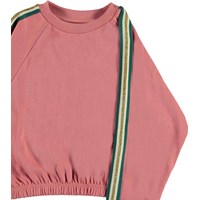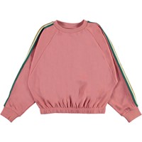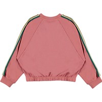 Malinda is a pink sweatshirt in a short shape with a striped green and gold band down the sleeves. Wear the top with matching trousers.