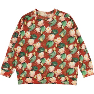 Mandy is a brown sweatshirt with a print of pink water lilies and green leaves. The sweatshirt has a wide fit.