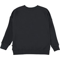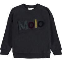 Mandy is a black sweatshirt with 'Molo' stitched in different colours on the chest. Mandy has dropped shoulders and rib at the sleeves, neck and bottom.
