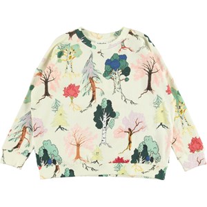 Mandy is a light coloured sweatshirt with a print of happy, colourful trees. It has a wide, loose fit.