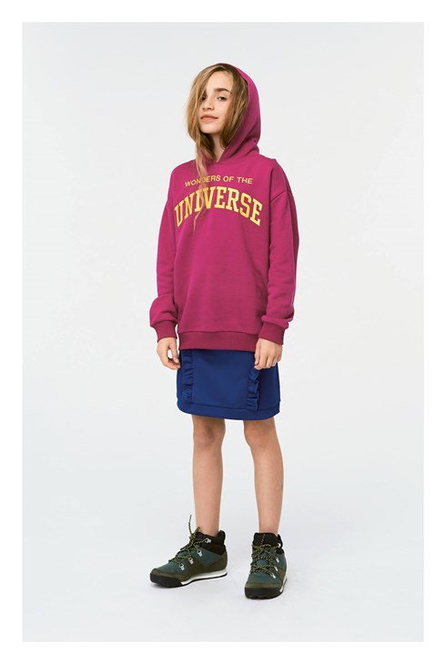 Manuela is a purple hoodie with the text 'Wonders of the Universe' embroidered in yellow across the chest.