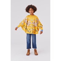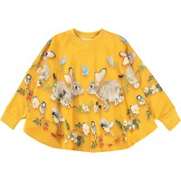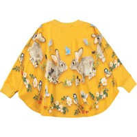 Marcella is a yellow poncho with a print of rabbits, birds and flowers. Size guide: S= 2-4 years M= 5-7 years and L= 8-12 years.