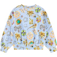 Orange sweatshirt made of organic cotton with a round neck and ribbed edges around the neck, bottom and sleeves. The sweatshirt has an oversized fit and a print of cute drawn animals.