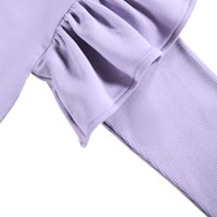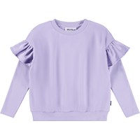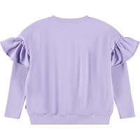 Purple sweatshirt made of organic cotton with ruffle details at the sleeves. This sweatshirt has a round neckline, long ribbed sleeves and ribbed edges around the neckline and waist. Combine it with the matching pants.