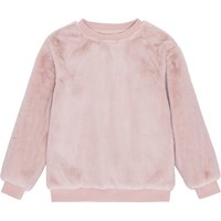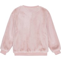 Pink exclusive sweatshirt in faux fur with a round neck and ribbed cuffs at the sleeves, neck, and waist. The sweatshirt is soft, warm, and has a loose fit, allowing for layering with a long-sleeved T-shirt on colder days.