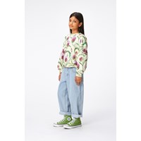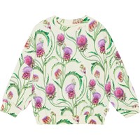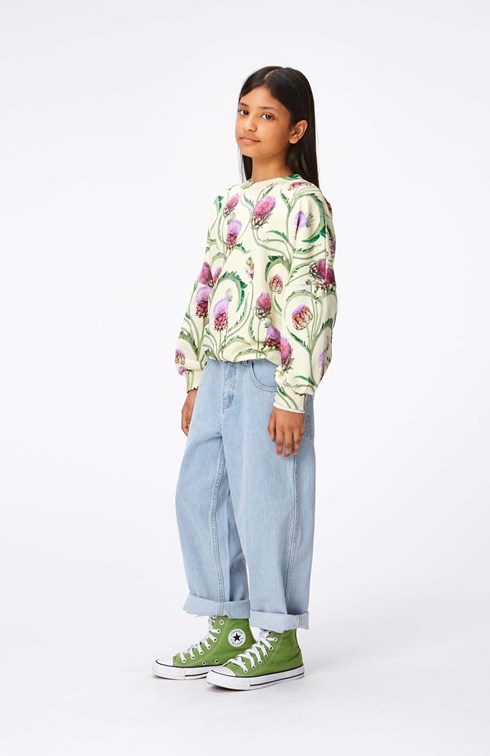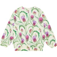 Yellow jumper in all over print of purple and red artichoke flowers in organic cotton. It has a rib edge at the round neck, sleeves and bottom. It is comfortable and in a loose fit, which makes it easy to pull on.