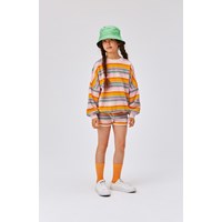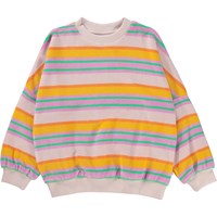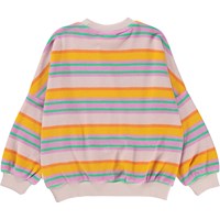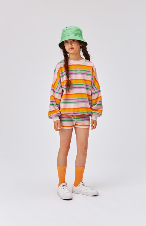 Marika is a pink terry sweatshirt with stripes in sunny yellow, orange, green and purple. Marika has a pink rib edge at the neck, sleeves and bottom. For a complete outfit, wear it with the matching Aliya shorts.