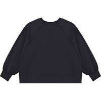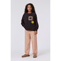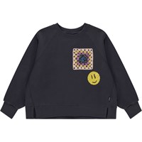 Black sweatshirt with sequin embroidery on the front. One of the sequin embroideries is a small, crocheted square in purple, yellow and blue, while the other is a smiley face in yellow sequins. This sweatshirt is in 100% cotton, has a round neck with a rib edge, rib at the sleeves, slits and bottom, a slanted side seam and is in an oversized fit.