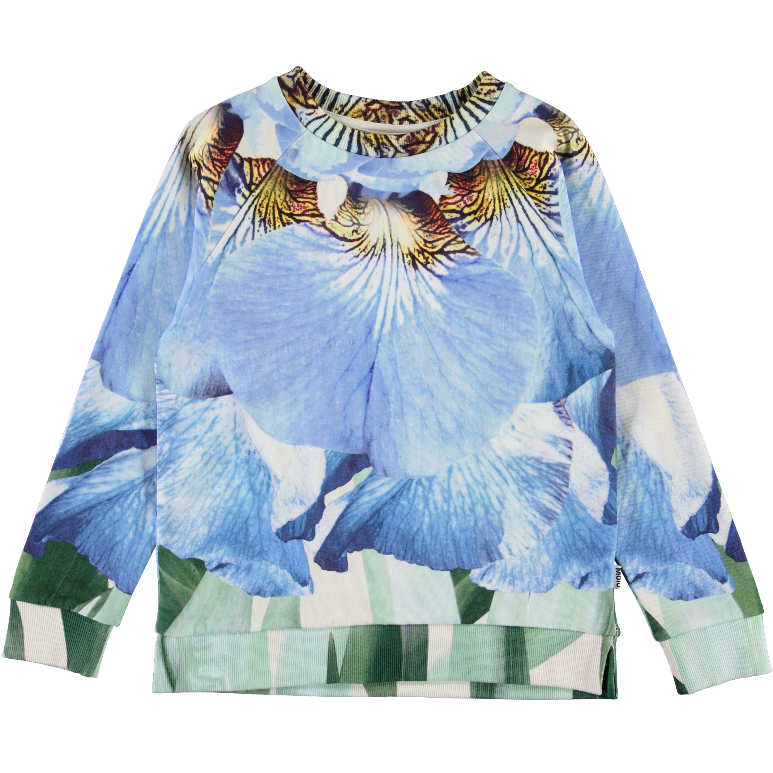 Marina is a sweatshirt with a print of large, blue petals. It has rib at the sleeves, neck and bottom. The sweatshirt has small slits at the sides. Wear it with the matching skirt.