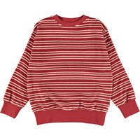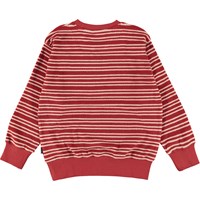 Mattis is a red terry cloth sweatshirt with white, horizontal stripes. Wear it with matching sweatpants.