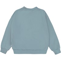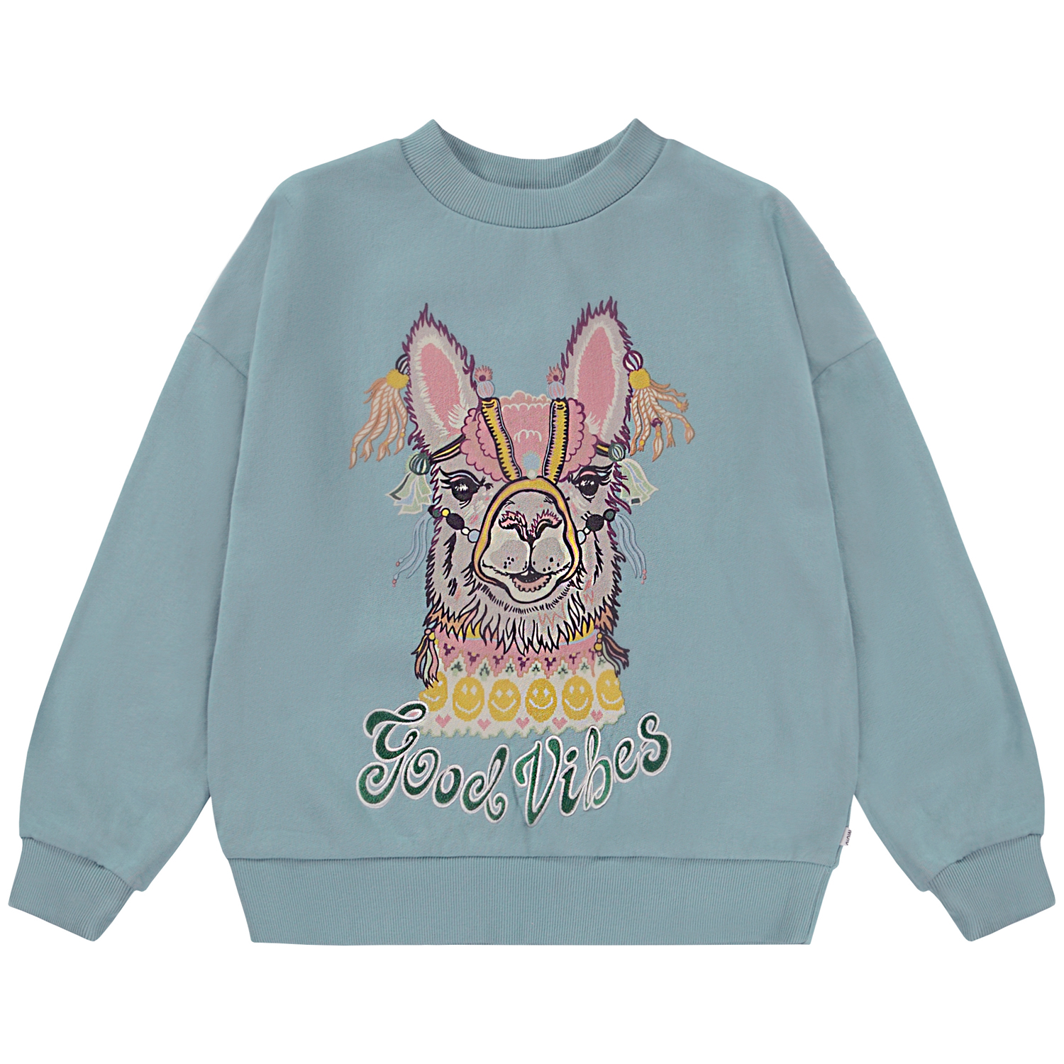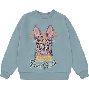 Light blue sweatshirt with a print on the front. The humourous print shows a llama that is wearing Molo's own knit jumper. This sweatshirt is in 100% cotton, has a round neck with a rib edge, rib at the sleeves and bottom and is in a loose fit.