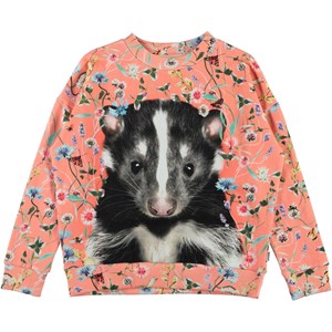 Maxi is a coral coloured sweatshirt with a print of wild flowers and a badger. The sweatshirt is in an oversized fit.