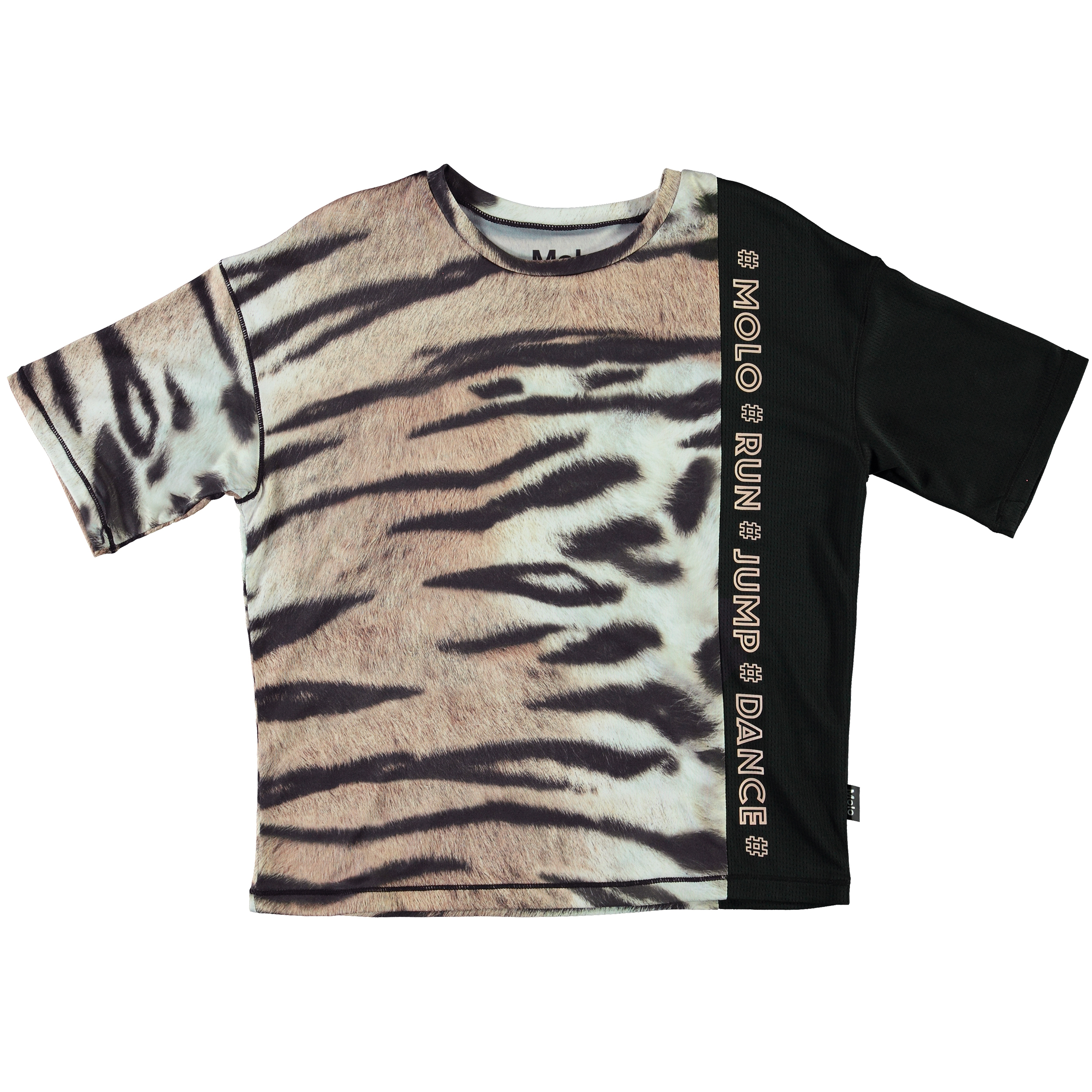 Odessa is a t-shirt in a cool tiger print with a black sleeve and side. The t-shirt is in a wide, comfortable fit. Odessa is part of Molo's sports collection, which helps integrate sports and fashion. it is comfortable and constructed in technical materials that make it wearable for down time as well as intense activity. Molo’s sports collection is created with a unique, high performance technology called HeiQ Smart Temp, which supports the body's own ability to cool down. The cool down function is activated when the body gets warm and sweaty, and then turns off when the body has cooled down. HeiQ Smart Temp ensures optimal comfort and performance. It has been independently tested to ensure that it is safe for the skin.