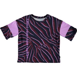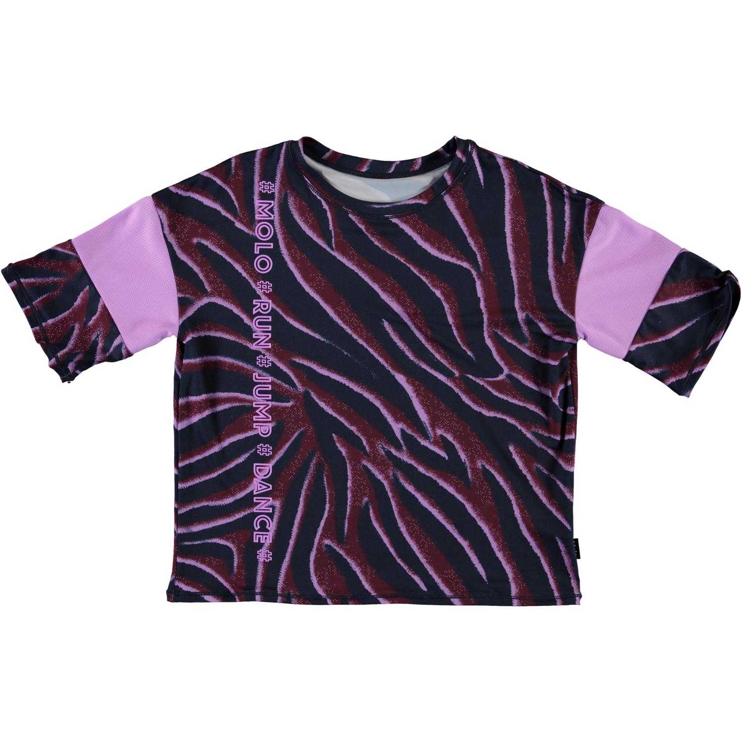 Odessa is a t-shirt in a zebra print in a comfortable, wide fit. The t-shirt has a wide purple stripe on each sleeve. Odessa is part of Molo's sports collection, which seamlessly unites sports and fashion. The top is comfortable and constructed in technical materials that make it appropriate for both intense activity and relaxed moments. Molo’s sports collection is made with a unique, high-performance technology called HeiQ Smart Temp, which supports the body’s natural ability to cool itself down. The cooling function is activated when you are warm and sweating. The cooling function becomes deactivated when the body has cooled down. HeiQ Smart Temp ensures optimal performance and comfort. Independently tested for skin safety.