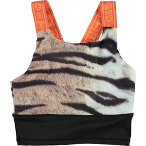 Oliva is a sports top with a cool tiger print and black bottom. The top has wide orange straps with a printed text. Olivia is a part of Molo's new sports collection, which seamlessly unites fashion and sports. Molo’s sports collection is made with a unique, high-performance technology called HeiQ Smart Temp, which supports the body’s natural ability to cool itself down. The cooling function is activated when you are warm and sweating. The cooling function becomes deactivated when the body has cooled down. HeiQ Smart Temp ensures optimal performance and comfort. Independently tested for skin safety.
