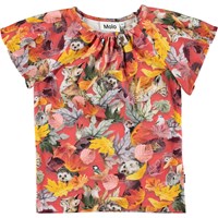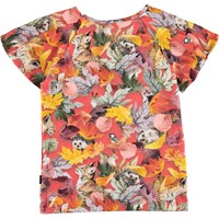 Rachel is a red t-shirt with a print of colourful leaves and various animals. The top has short, wide sleeve that have a beautiful drape.