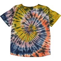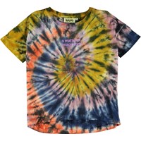 Raeesa is a t-shirt with a spiral tie-dye print in gorgeous colours and with the text 'A matter of imagination'. The t-shirt is slightly longer in the back.