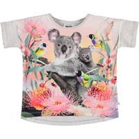 Raeesa is a grey t-shirt in a wide fit. There is a print of a koala with tropical birds and flowers on the front.