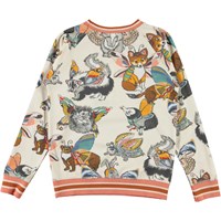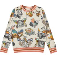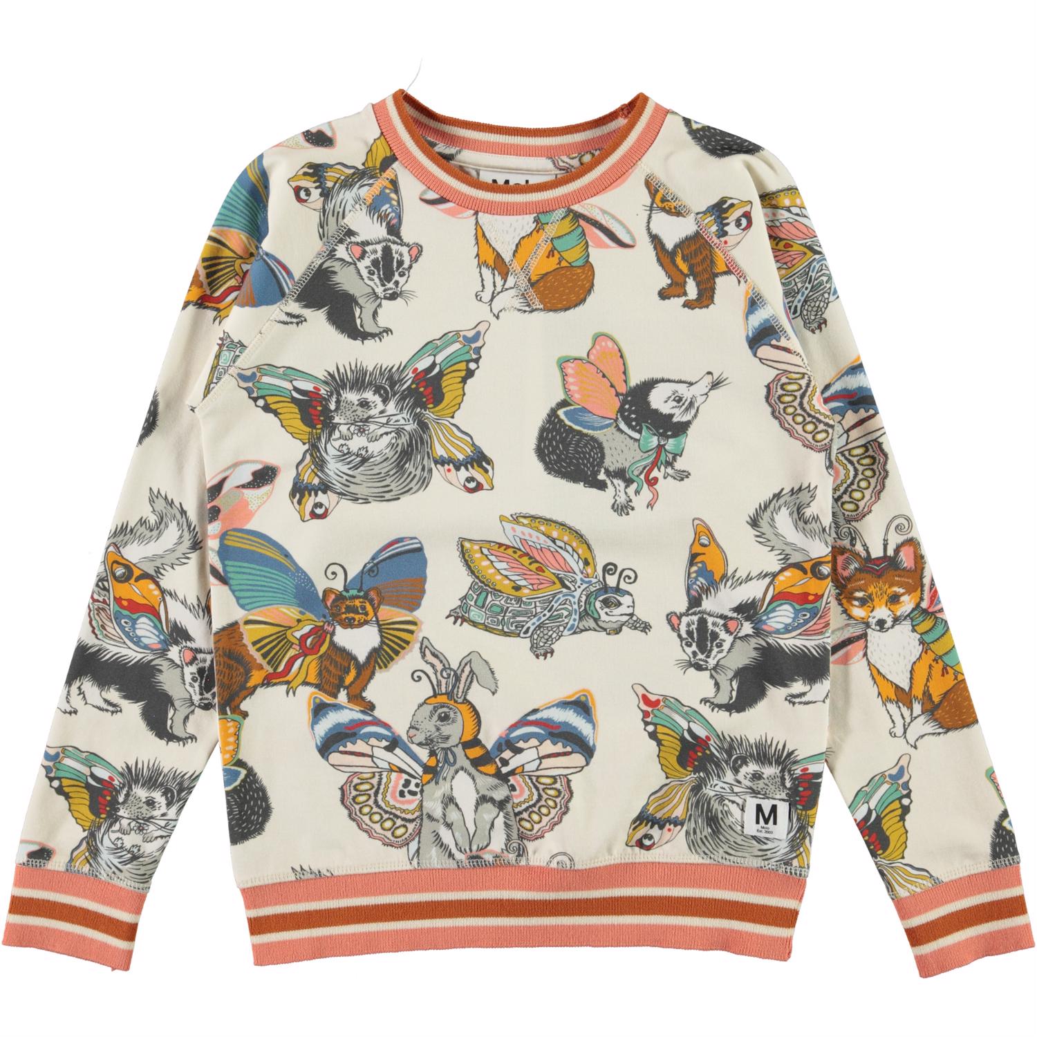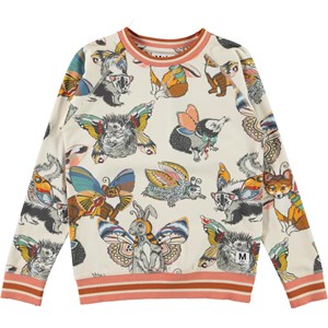 Raewyn is a light coloured top with long sleeves and a print of forest animals with wings. Can you identify the animals, even with wings? Raewyn has a striped rib edge, which matches the colour of the print, at the neck, sleeves and bottom.