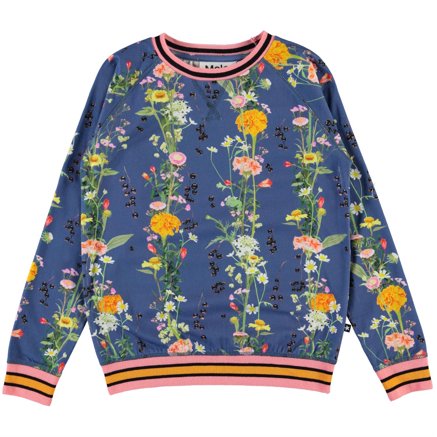 Raewyn is a blue top with a print of vertical flower chains. The top has raglan sleeves and pink striped rib edges at the sleeves, neck and bottom.