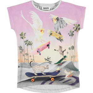 Ragnhilde is a purple t-shirt with a print of birds and cats on skateboards. The t-shirt has very short sleeves and is slightly longer in the back.