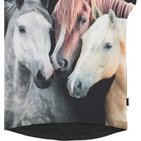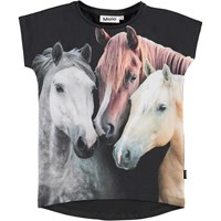 Ragnhilde is a black t-shirt with a print of three horses on the front. It has very short sleeves and is longer in the back.