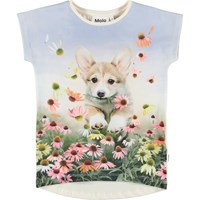 Ragnhilde is a t-shirt with short sleeves and a print of a dog that is running among the flowers.